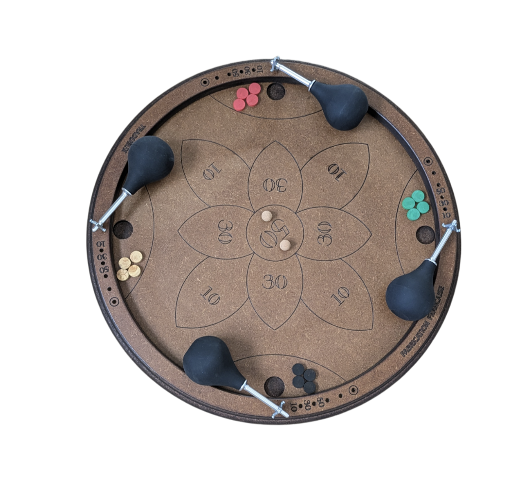 Marquer des points en lançant des pions vers le centre de la planche de jeu, en essayant de les faire atterrir dans les trous situés au centre. Les joueurs s'affrontent pour obtenir le meilleur score en utilisant des techniques de tir et de défense tout en empêchant l'adversaire d'obtenir des points. Le joueur avec le score le plus élevé à la fin de la partie remporte la victoire.